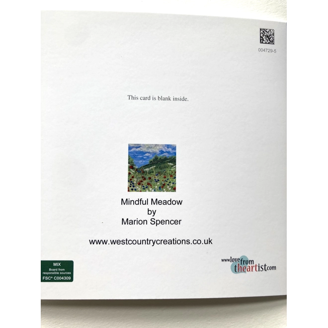Price includes UK second class mail. Quality printed square card ,blank inside for your own message from an original acrylic painting 'Mindful Meadow' by Marion Spencer. Posted to you in a cardboard backed envelope or can be hand written and sent direct to another recipient for no extra charge. Just message with the details.